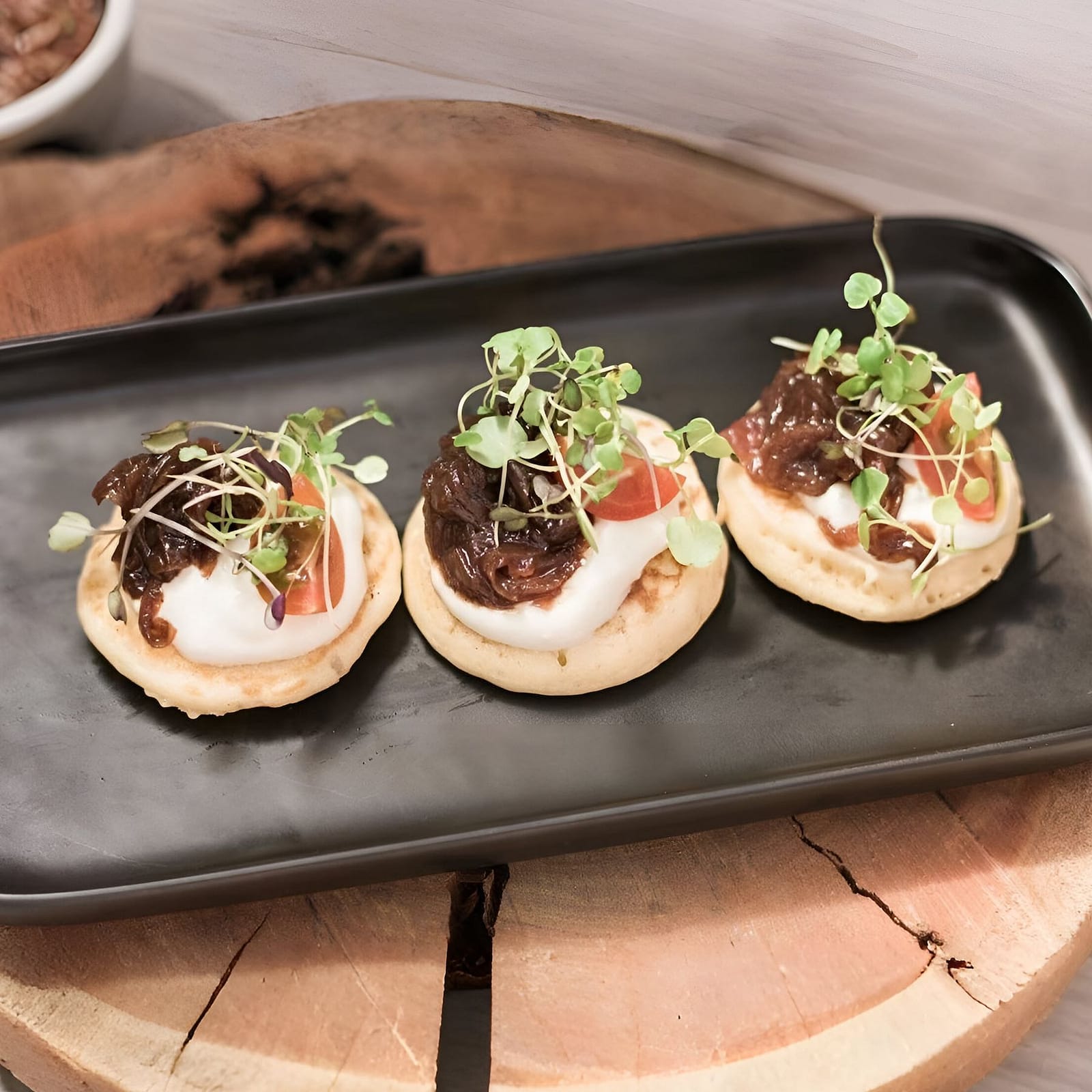 Fluffy bite-sized blinis topped with sweet red onion confit, silky crème fraîche and fresh chives — an elegant vegetarian canapé with a perfect balance