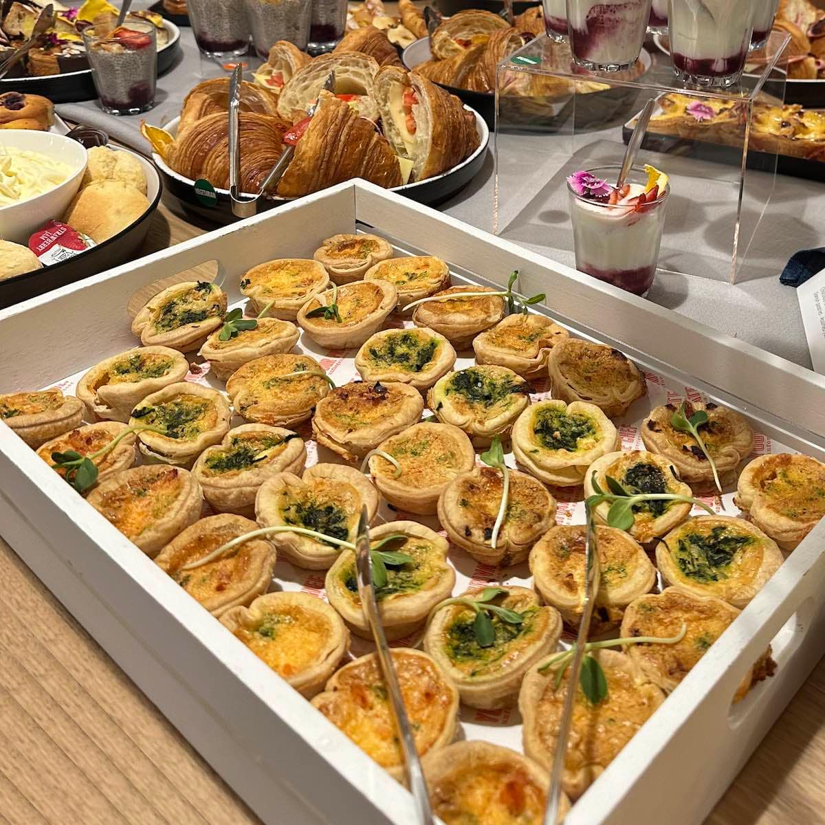 A trio of bite-sized quiches: classic Quiche Lorraine, smoked salmon with dill, and vegetarian spinach & feta — perfect for a sophisticated, flavourful selection.
