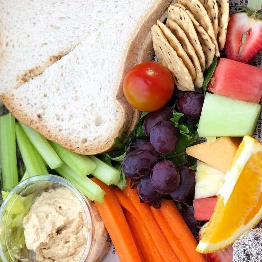 Each box includes 1 x Ham and Cheese Sandwich (or request cheese and butter only if preferred) Hummus, carrot, cucumber, celery sticks & rice crackers (v, gf, df) Triple choc mini brownie Fruit skewers- kids (V, DF, GF)