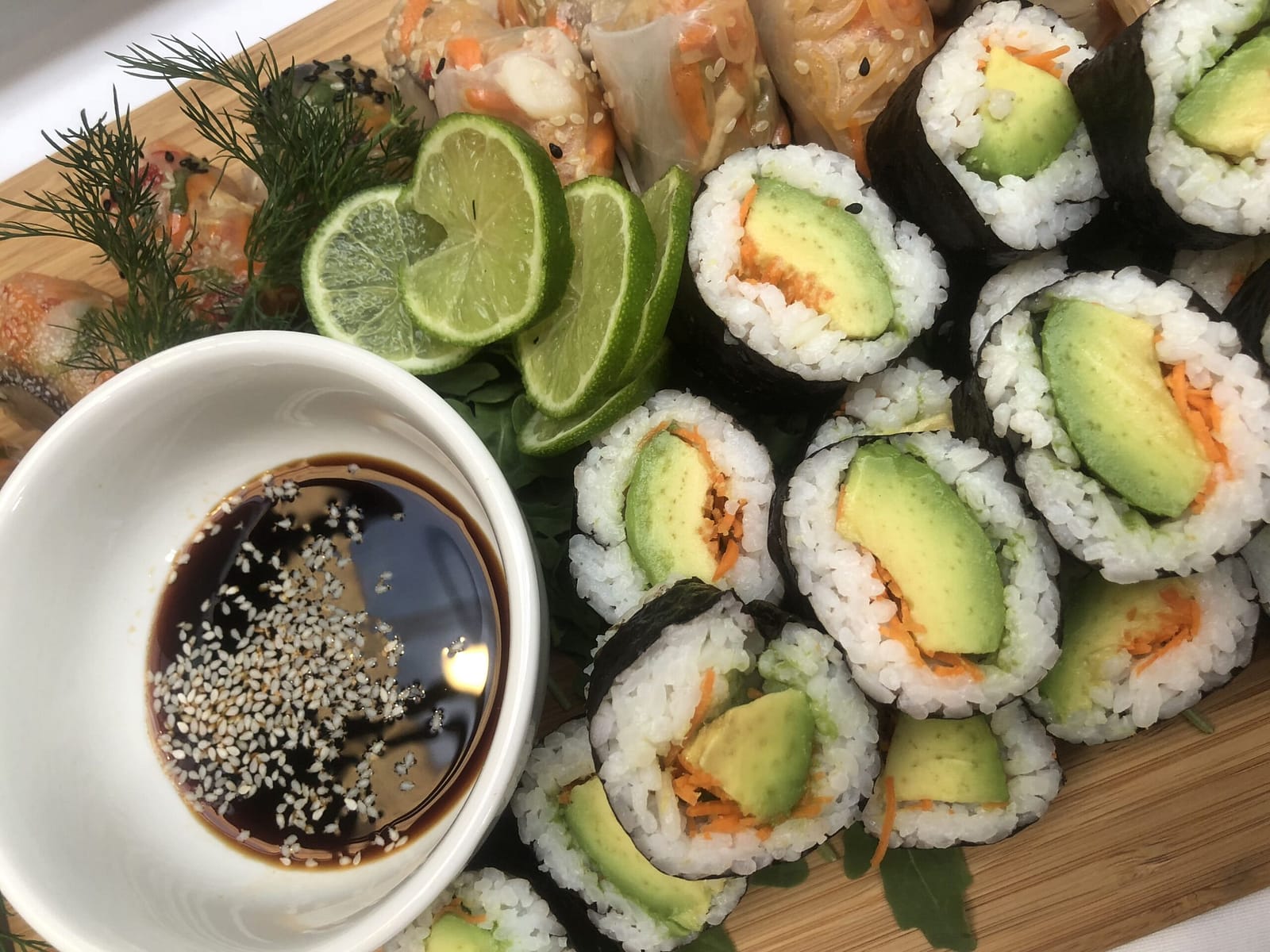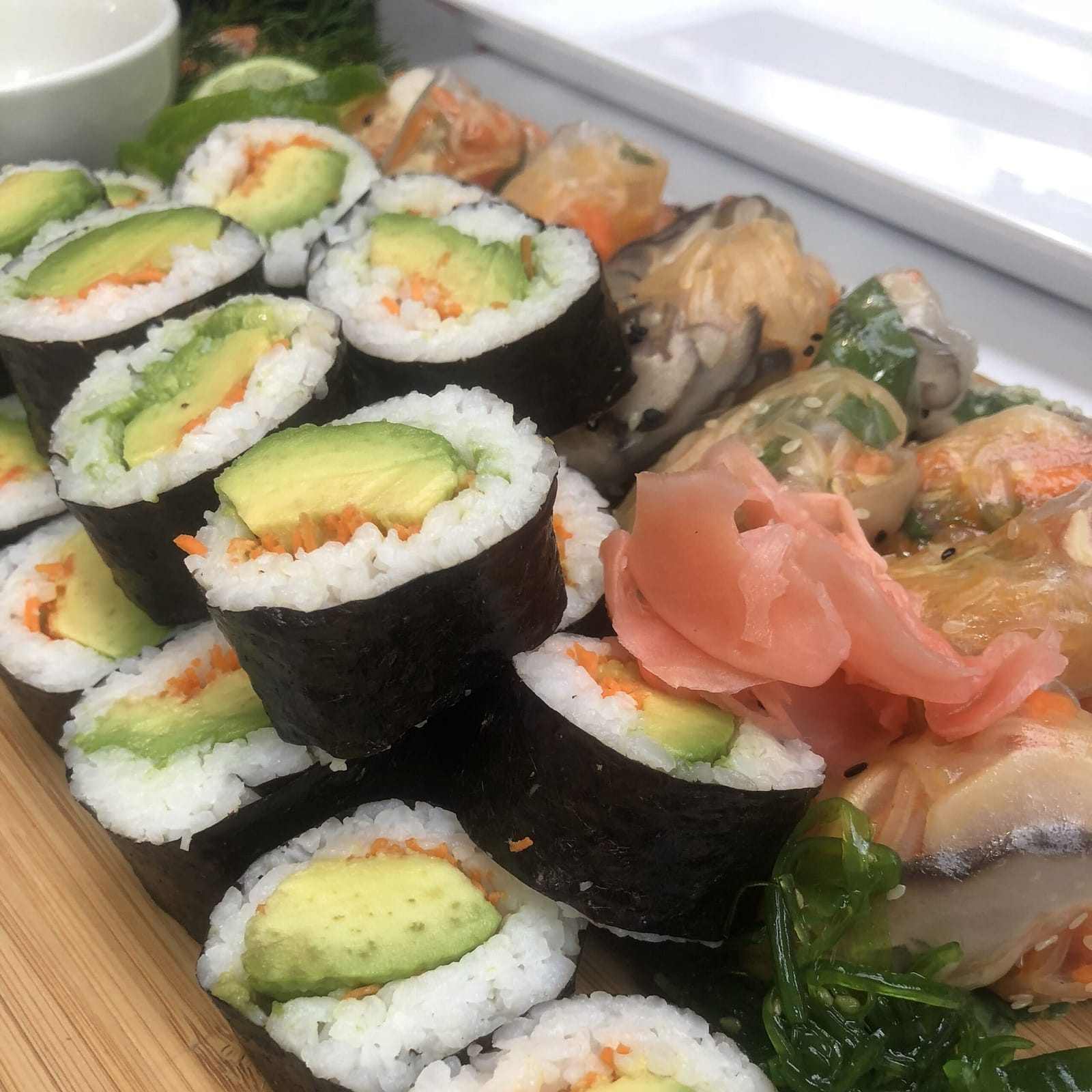 Nori sushi rolls with a mix of chicken, seafood and vegetarian options soy sauce (1 per serve) (df)