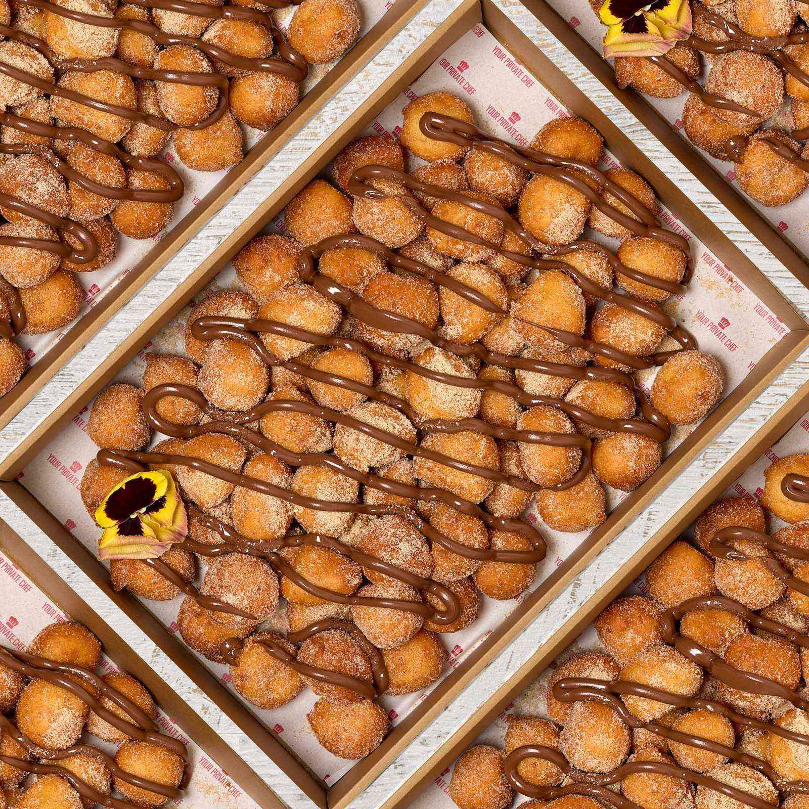 Nutella Fritule Donuts Box – Small Croatian Donuts rolled in cinnamon sugar topped with chocolate sauce