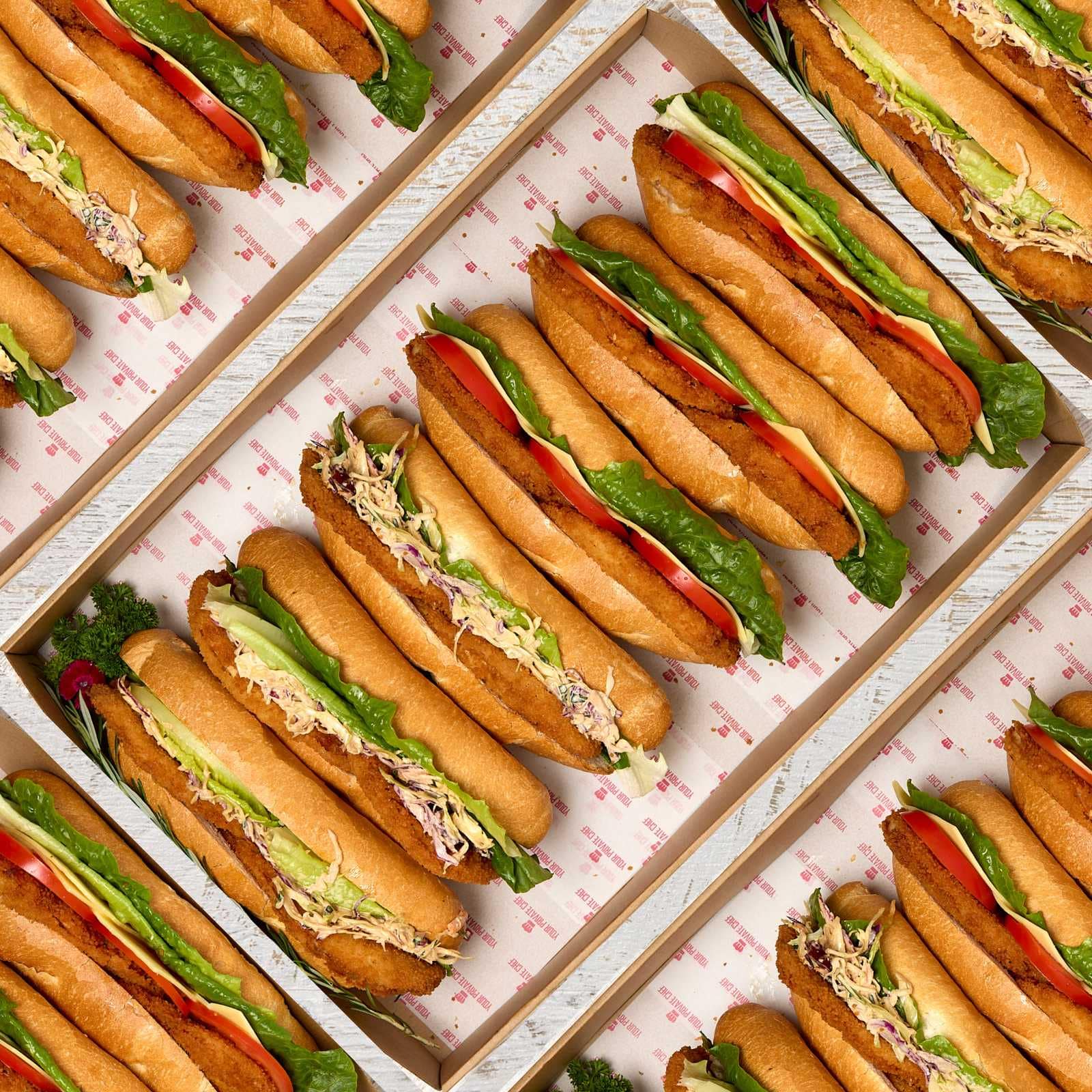 Fully loaded crunchy Italian rolls with Crunchy Banh Mi Rolls w Chicken Schnitzel & Slaw AND Chicken Schnitzel & Cheese, Tomato, Lettuce Each Platter contains 6 large rolls cut in half to give 12 pieces.