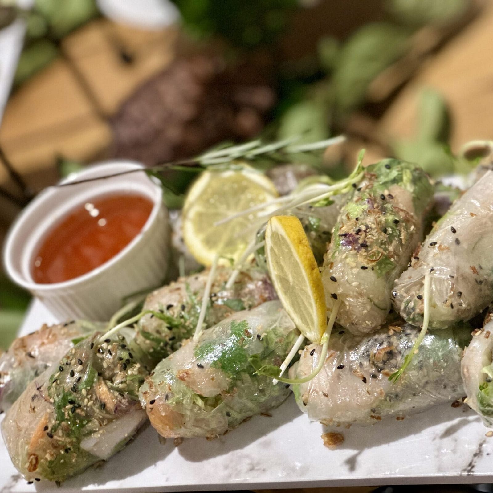 Shitake and water chestnut rice paper rolls with chilli lime dipping sauce (vegan, gf)