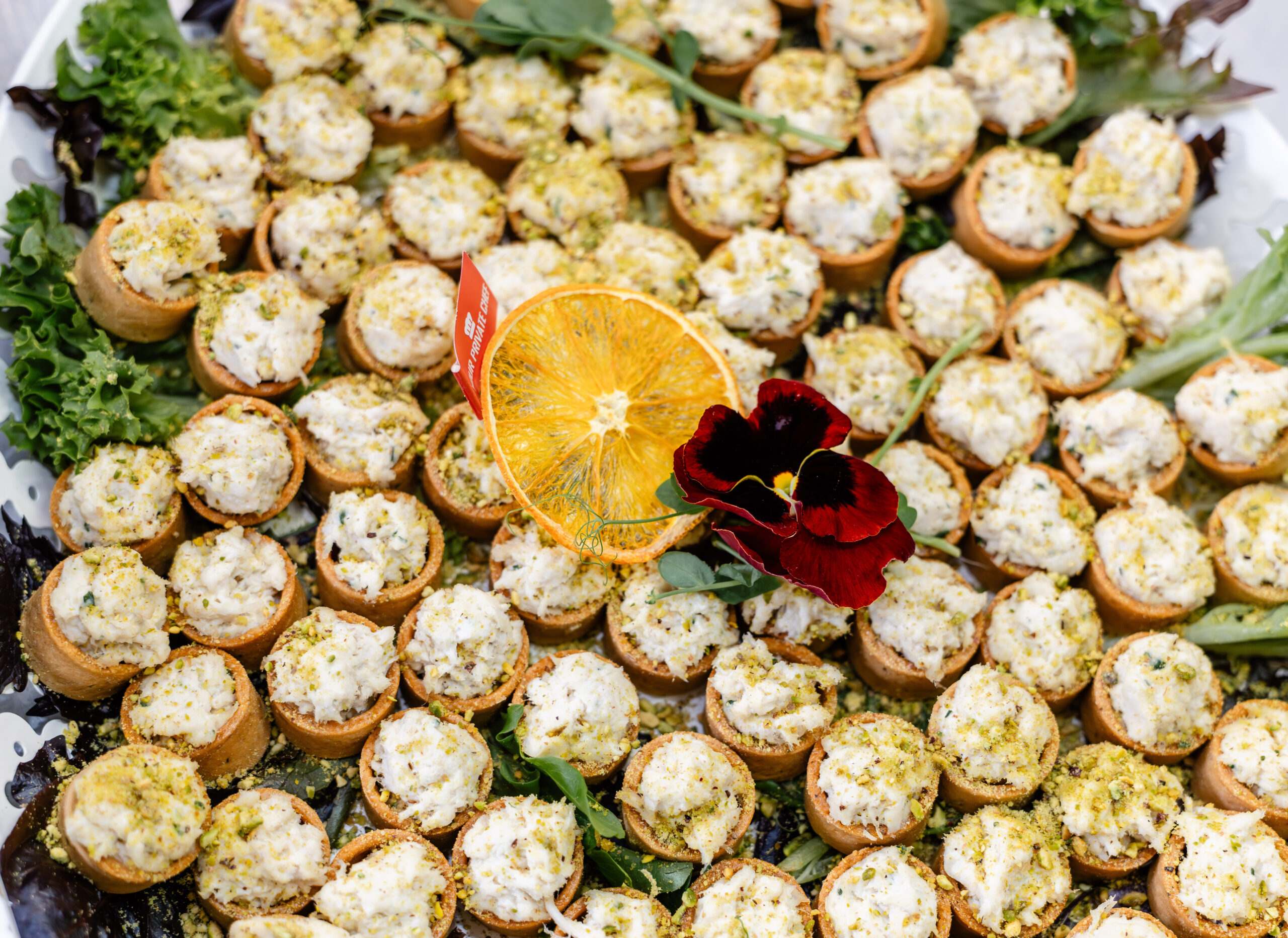 $28 per item (min 12) Smoked chicken & crushed pistachio, lemon mayo, in shortcrust tartlets shell
