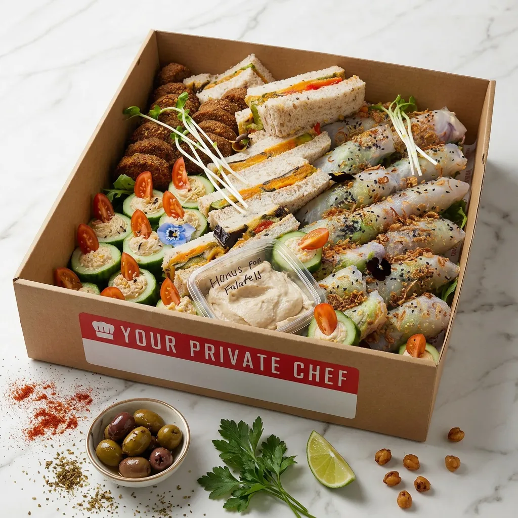 48 piece platter Falafel with hummus (vegan, gf) (12) Avocado and garlic sesame rice paper rolls with chilli lime dipping sauce (vegan, gf) (12) Roasted vegetable finger sandwich, relish (vegan) (12) Spiced avocado salsa in a cucumber cup & micro herbs (v, gf, df, vegan) (12)